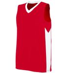 4.8 ounce 50% polyester/50% cotton jersey knit * Contrast color V-neck collar * Set-in sleeves with contrast color sleeve stripes