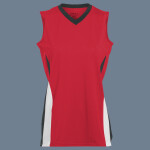100% polyester wicking knit * Wicks Moisture * Ladies' fit * Tagless label * Contrast color V-neck collar * Contrast color inserts * Designed to be NFHS compliant